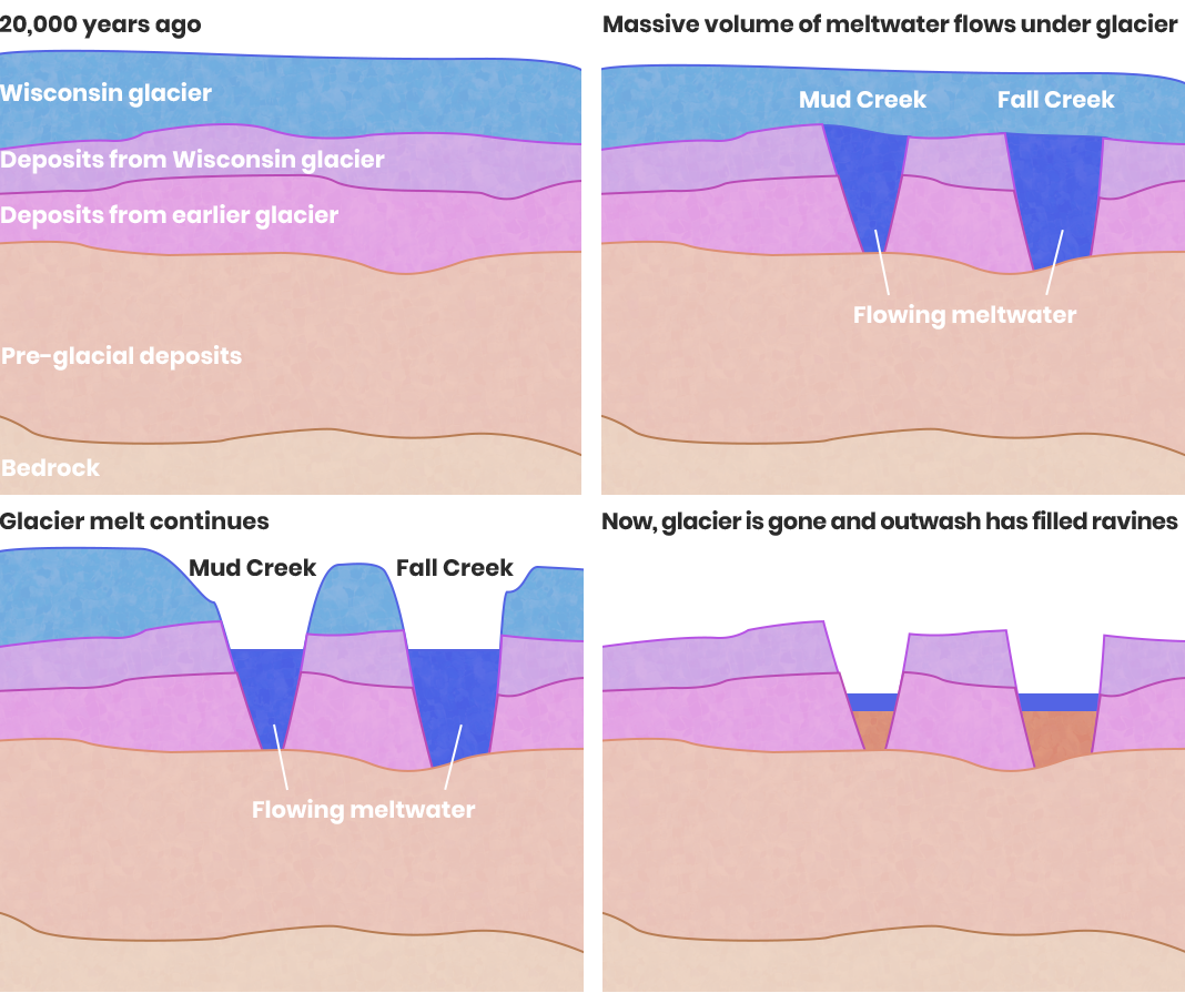Four illustrations showing the effects of glacial meltwater over time on the earth's surface.