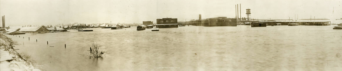 View looking West of the White River after the March, 1913 flood. The Marion Motor Car company and Parry Buggy Factory, underwater, are labeled.