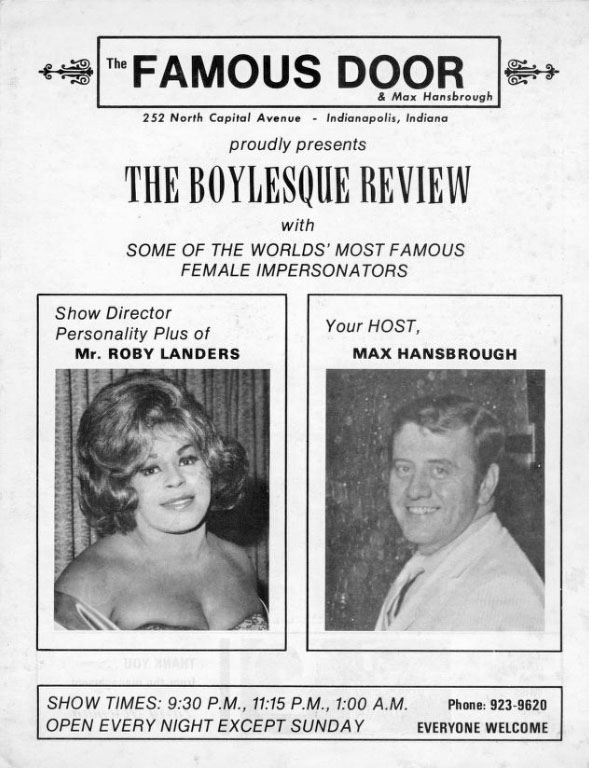 The Famous Door was a popular Indianapolis entertainment venue that inspired future LGBTQ+ bars and clubs in the city by bringing the city’s drag scene to widening audiences and communities. The club provided an upscale environment and high-end performances, and, unlike many of its peer businesses of the era, it catered to a clientele that was diverse in terms of race, gender, and sexual orientation. The venue used the same name as an earlier Indianapolis business that “Maurice Britches” Brown, Forest McBain, and Ernest “Rip” Brown owned on , though it was a separate business unconnected to that establishment.